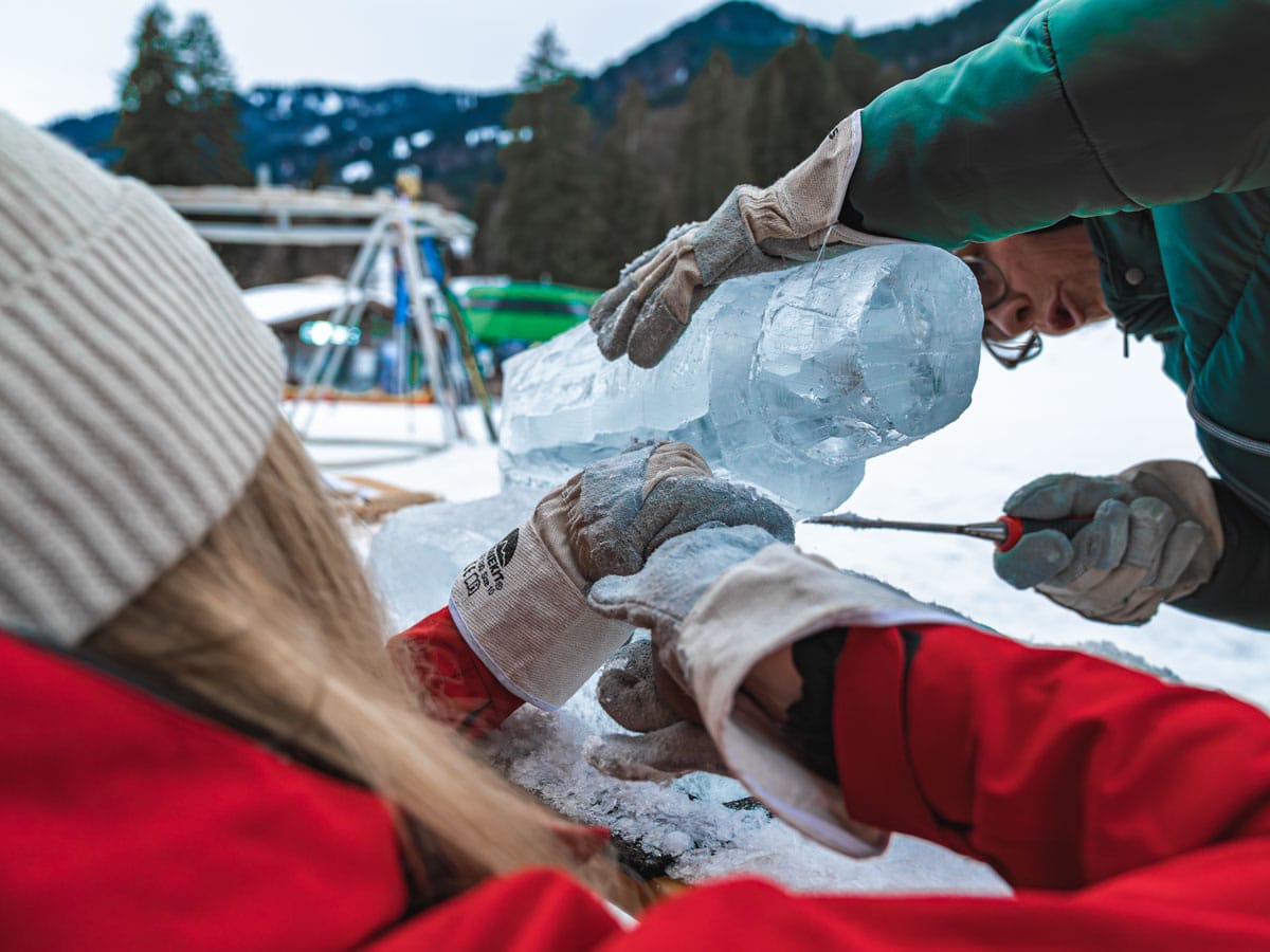 Nach einer kurzen Einweisung in Werkzeuge und Technik kann es direkt losgehen: Mit Stemmeisen, Handsägen und Gummihämmern formt jedes Team seinen Eisblock Schritt für Schritt zum Kunstwerk.