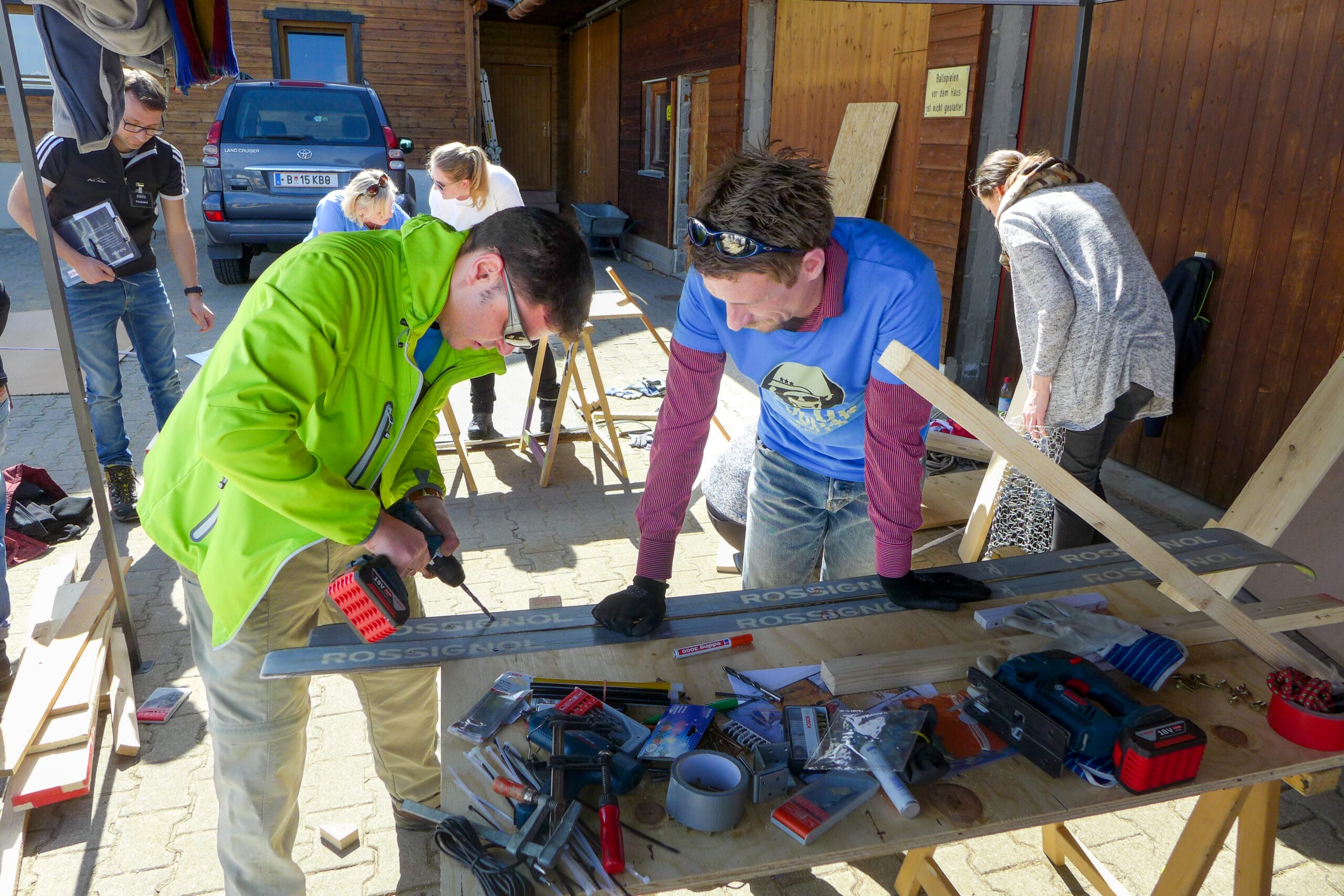 Die Gruppe wird in mehrere Teams aufgeteilt. Jedes Team erhält die gleiche Aufgabe: den Bau eines fahrtüchtigen Pulka-Schlittens.