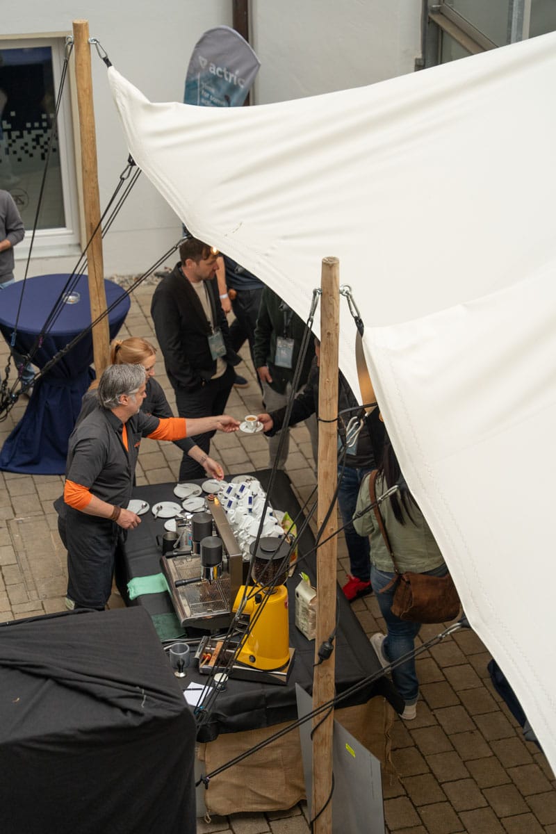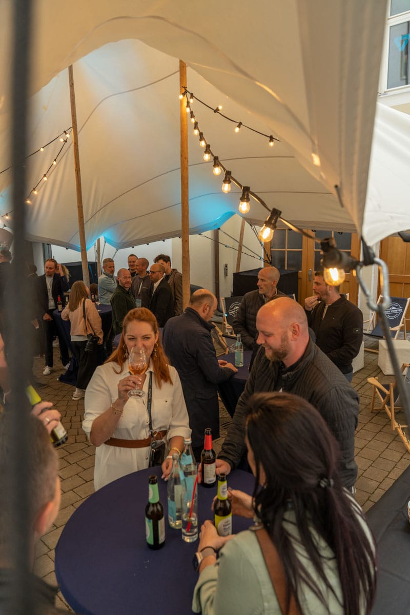 Im angrenzenden Innenhof schufen wir eine großzügige Lounge-Area mit Stretch-Zelt, Ambientebeleuchtung und Heizstrahlern. Hier konnten die Gäste nach den Führungen bei Getränken und Snacks verweilen, networken und sich mit den actric-Profis zum neuen Standort und seinen Hörakustik-Lösungen austauschen.